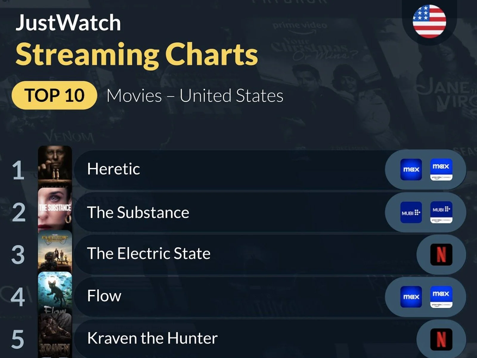 From movies like Heretic and The Substance to action-filled adventures like Kraven the Hunter - the movies secure my attention. But solid TV shows, too? I’m here for ‘em. Peep this week’s Top 10 lists.