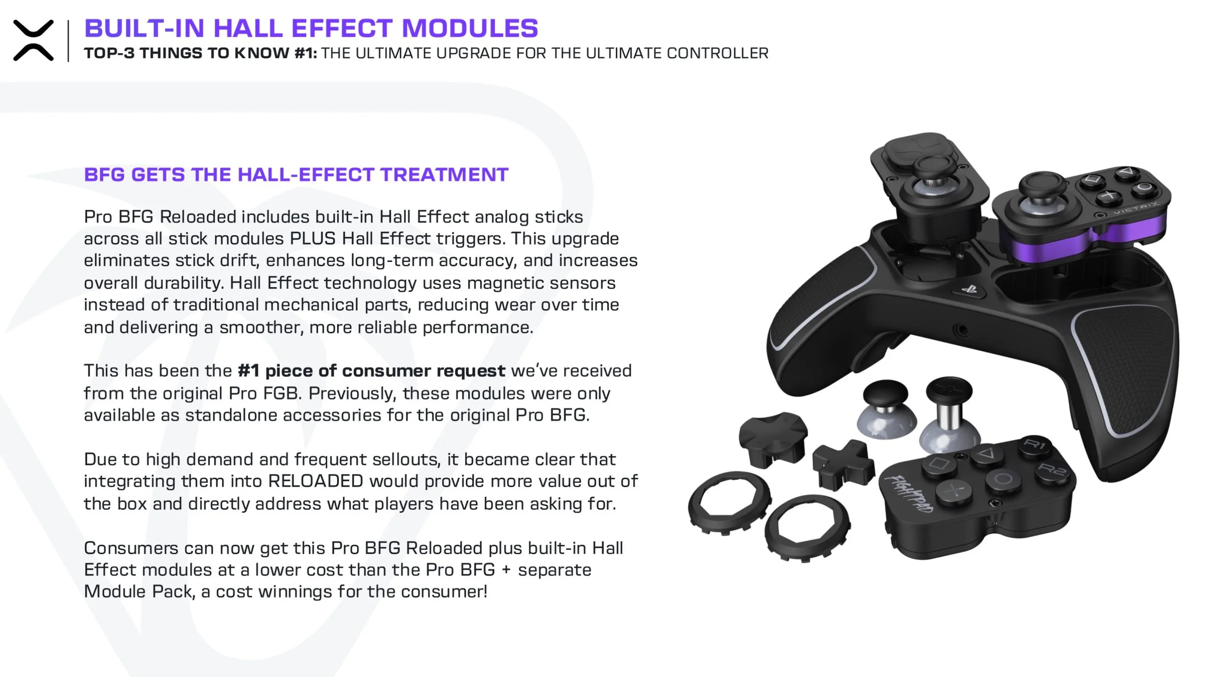 Leading gaming accessories maker Turtle Beach Corporation (Nasdaq: TBCH) and its Victrix esports brand, today announced the new Turtle Beach® Victrix™ Pro BFG™ Reloaded Wireless Modular Controller. The successor to the original top rated Victrix Pro BFG controller that’s already well-regarded and used by competitive esports gamers and the fighting game community (FGC) the world over, the new Victrix Pro BFG Reloaded controller now includes a reconfigured Fightpad module that’s ergonomically optimized for gamers to place their wrist on the controller’s grip – putting key buttons within easier reach, and comes with Hall Effect thumbsticks and triggers – two of the most sought-after upgrades requested by fans.