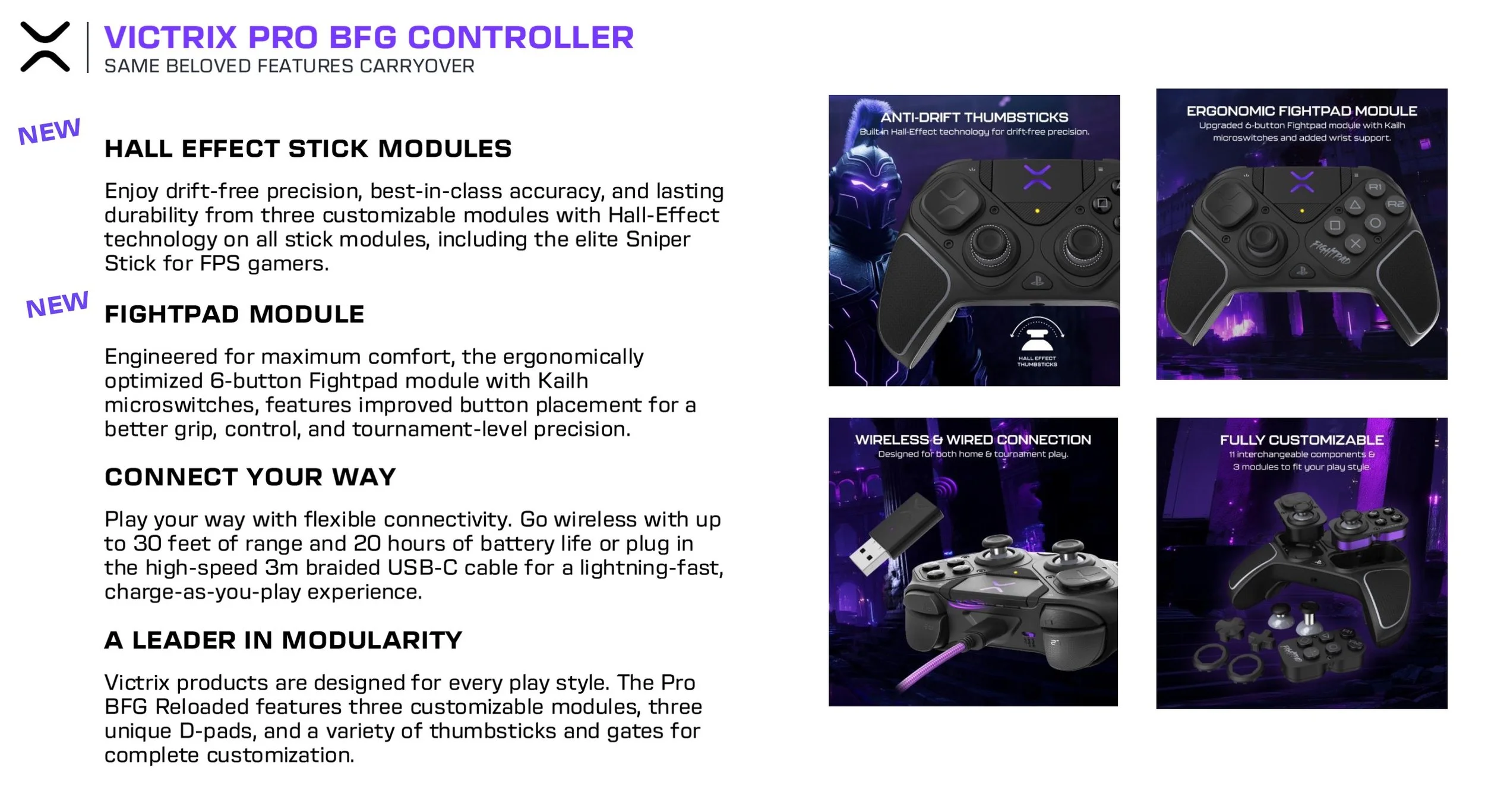 Designed with a modular layout, the Victrix Pro BFG Reloaded controller adapts to any playstyle, whether playing fighting games, first-person shooters, or action-packed RPGs. At the controller’s core are customizable modules with built-in Hall-Effect technology, ensuring drift-free precision and consistent, reliable input accuracy. With three modules and 11 interchangeable components, including various thumbsticks (two standard caps, one dome cap, one sniper stick), and a selection of D-pads and gates, gamers can customize their controller for optimal comfort and performance.
