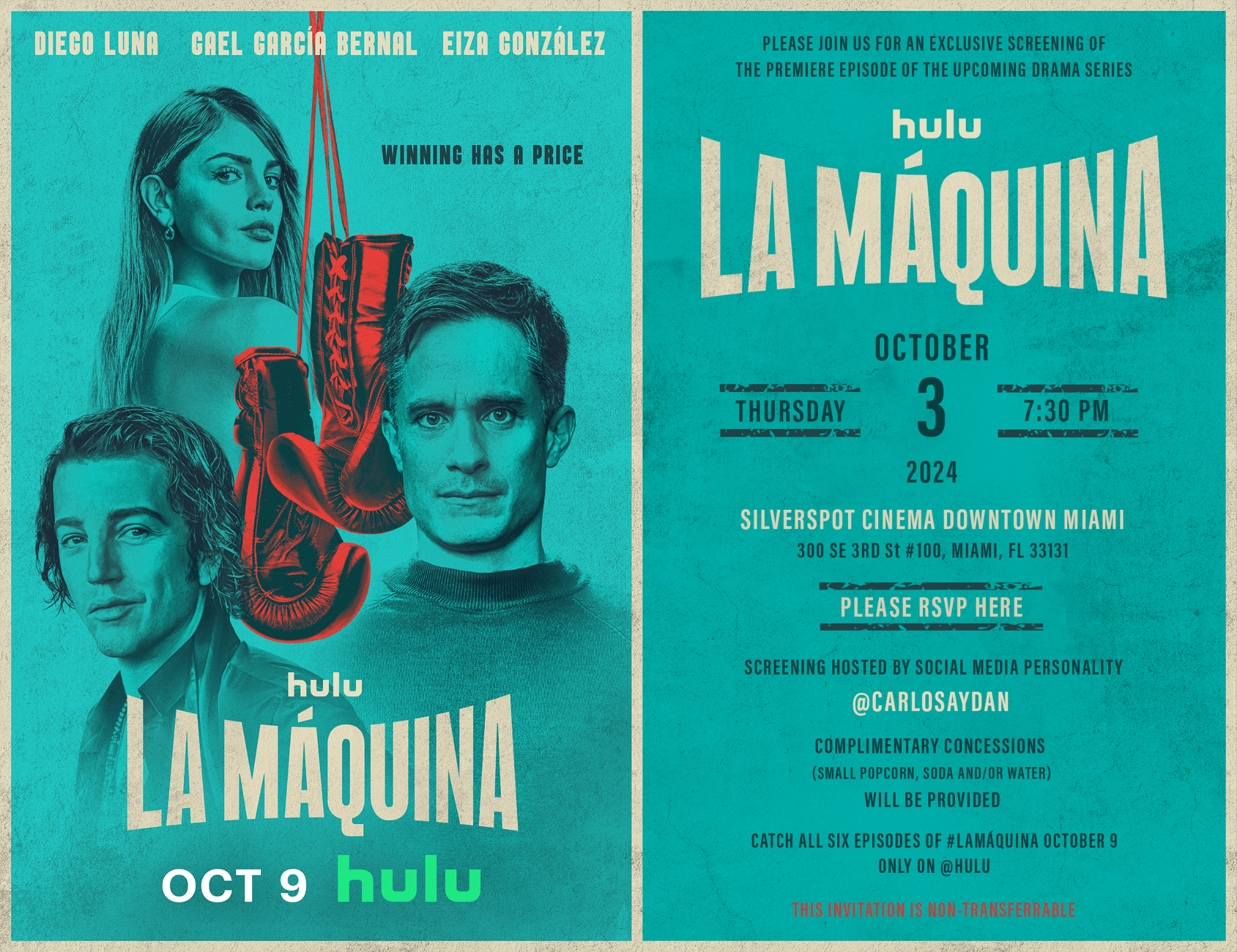 Want a reason to turn up in Miami and Houston tonight? Turns out the upcoming Hulu six-episode series ‘La Maquina’ arrives October 9 but there’s an exclusive screening going down in both hot spots tonight!